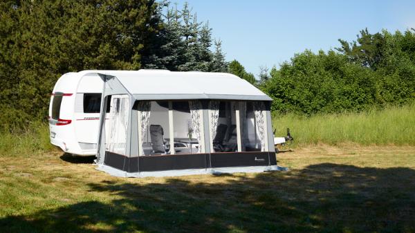 Universal 360 og 420 Dawn er deltelte, der med stor styrke og stabilitet kan stilles op i alt slags vejr – på alle årstider. To støttestænger presser de fastsyede skumgummipuder fast ind mod vognen, samtidig med at klikprofiler fastholder gavlene direkte på støttestangen for optimal tæthed.