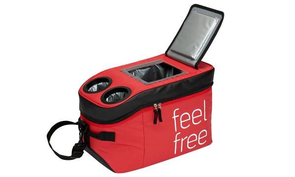 Køletasken fås i en smart rød farve med Isabella logo på toppen og ”feel free” på den ene side.