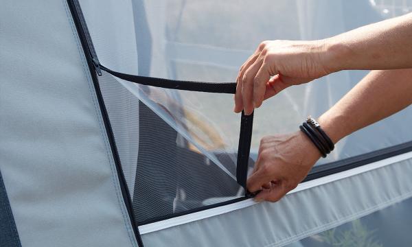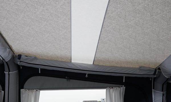 Front canopy (air beams), light panels in the roof, two large ventilation windows with mosquito nets at both ends, IsaAir system, Isacryl fabrics; extendable.
