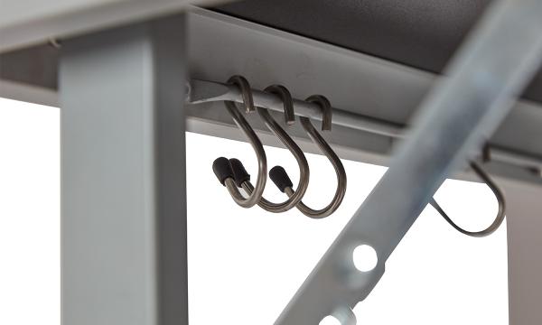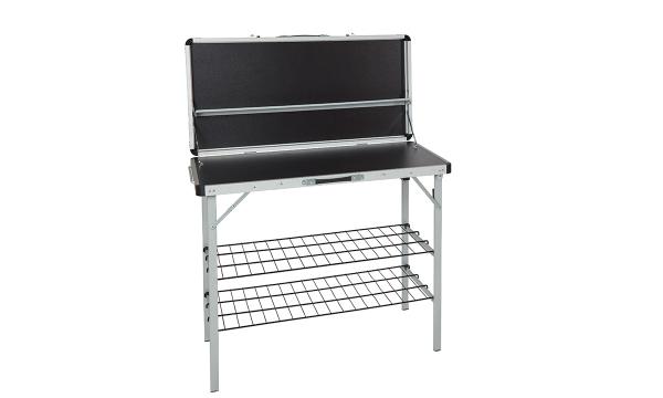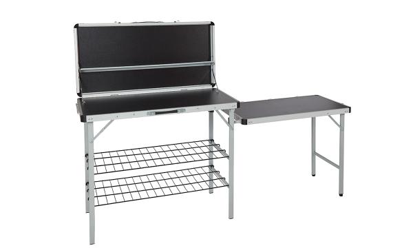 Kjøkkenet er utstyrt med et høyt arbeidsbord der det er god plass til å kokkelere og et mindre bord til gassbluss. Under arbeidsbordet er det romslige hyller der du kan oppbevare ingredienser og kjøkkenutstyr. Kjøkkenet er praktisk innrettet og lett å holde rent. Sammenleggbart lokk, kroker til diverse redskaper og hylle til krydder. Oppbevaringsveske medfølger.
