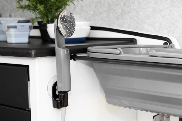 Vannkranen er oppladbar og utstyrt med et utskiftbart dusjhode. Den passer både til Camp-let og et frittstående kjøkken.