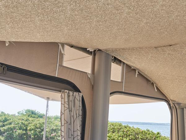 Vacuum or brush awning off when it is dry. Subsequently, wipe with a damp cloth.